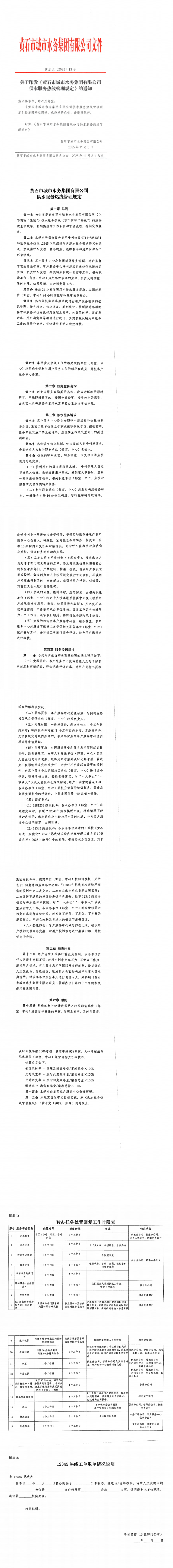 关于印发<<黄石市城市水务集团有限公司供水服务热线管理规定>>的通知